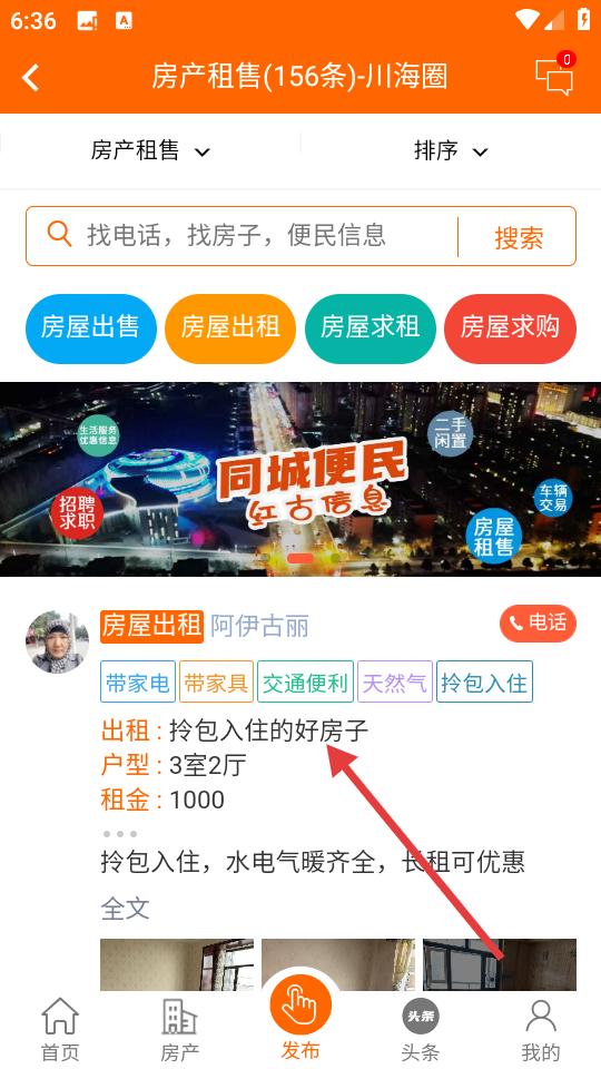 3、进入房产租售页面,查看房屋出售、出租等分类及相关房源信息,点击感兴趣的房源。