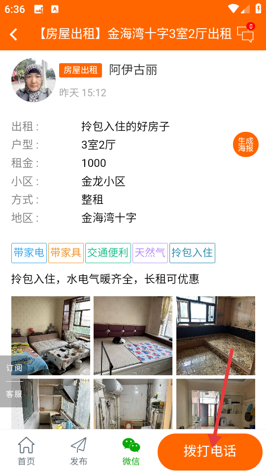 4、进入房源详情页,查看户型、租金、小区等信息,点击【拨打电话】联系房东。
