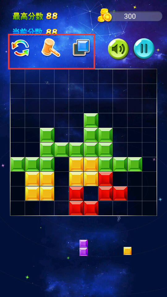 3、遇到困难时,利用上方刷新、锤子等道具,调整方块或消除阻碍,优化拼接。