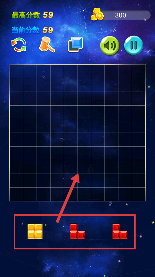 2、将下方不同形状的方块拖动到上方网格合适位置,进行拼接。