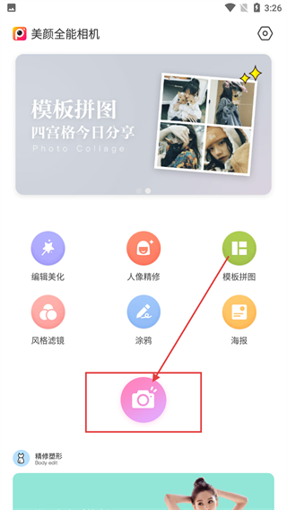1、在【美颜全能相机】界面,点击中间粉色的相机按钮,可进入拍照相关流程。