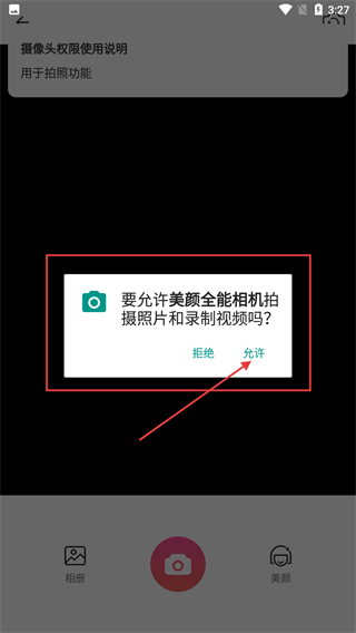 2、弹出【要允许美颜全能相机拍摄照片和录制视频吗?】提示框时,点击【允许】按钮获取相机权限。