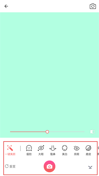 3、进入相机界面后,点击底部右侧的【美颜】按钮,可进入美颜功能设置页面。