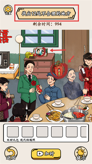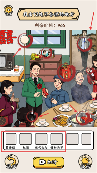2、接着找新的不合理处,点击【现代台灯】、【红酒】,还有桌上的【鸳鸯锅】以及门口的【镭射马甲】,收获满满呀。