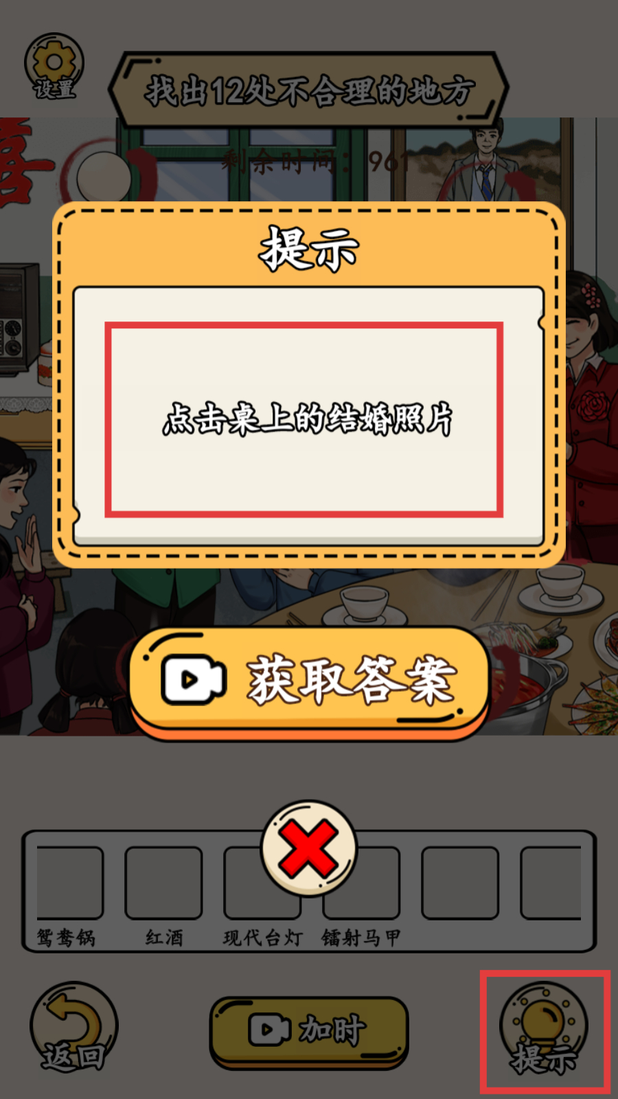 3、要是找不全,就点击右下角【提示】按钮,根据提示去点击桌上的结婚照片,能快速推进关卡哦。