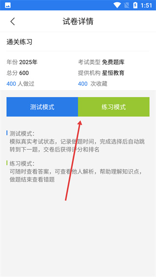 3、在试卷详情页,选择【练习模式】(可随时查看答案、解析,帮助理解知识点)。