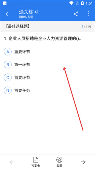 4、进入练习模式后,看到题目“企业人员招聘是企业人力资源管理的()”,答案选A“重要环节”。