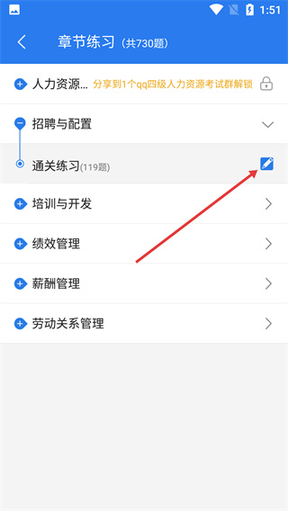 2、在章节练习页面,点击“招聘与配置”下的【通关练习(119题)】,进入试卷详情页。