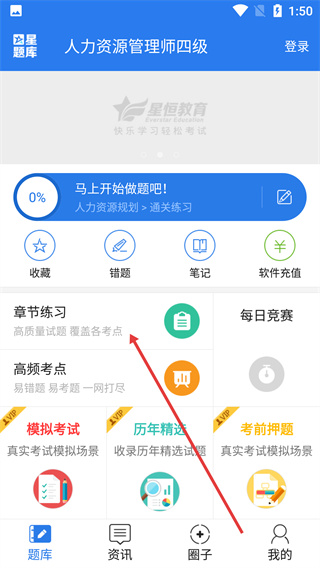 1、在“人力资源管理师四级”页面,点击【章节练习】,进入章节练习页面。
