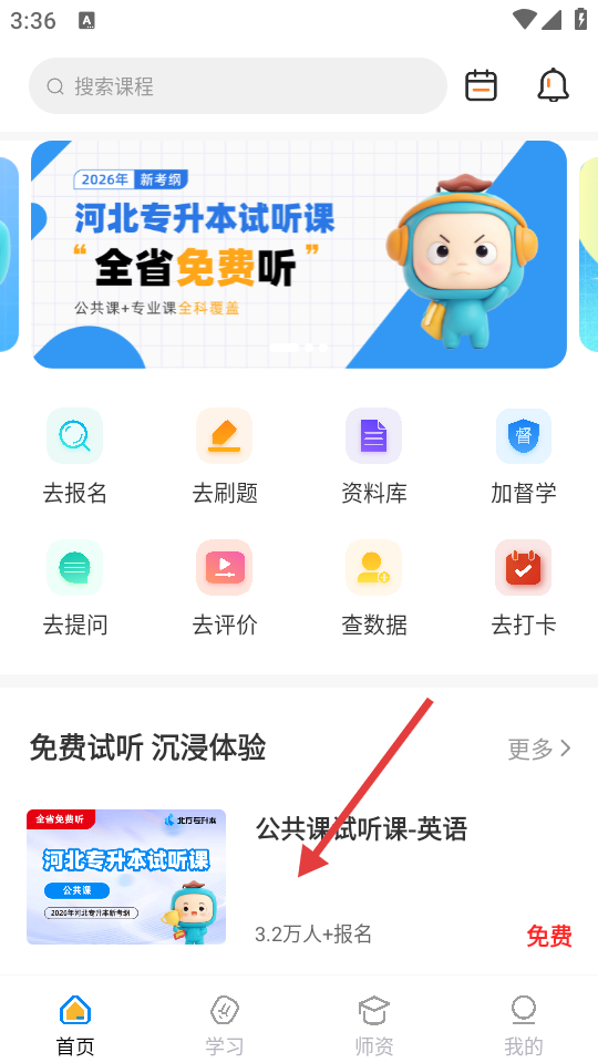 1、打开APP进入首页,点击下方试听课程,点击进入。