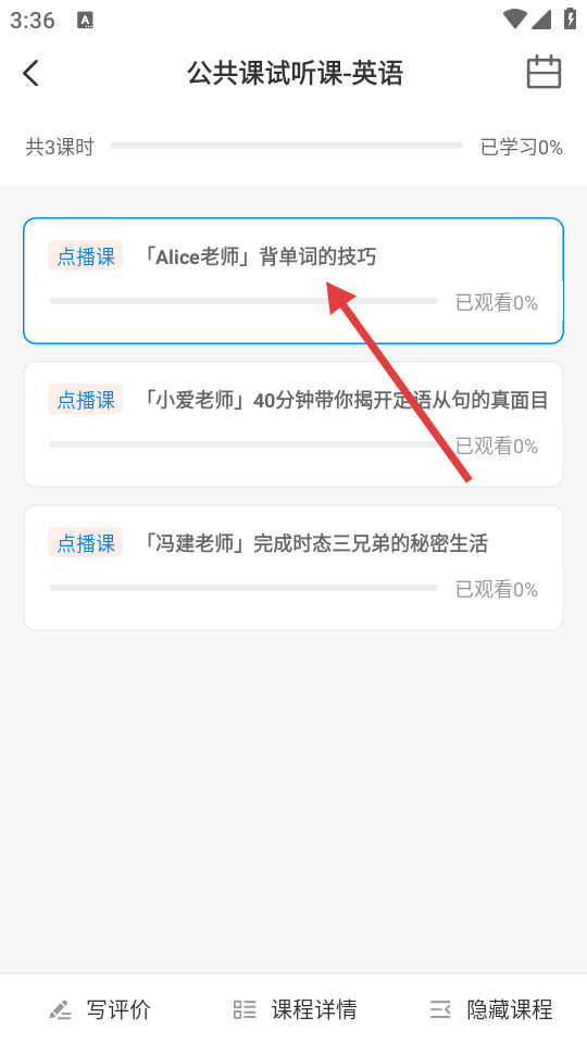 3、进入课程列表页面,选择如“「Alice老师」背单词的技巧”课程。