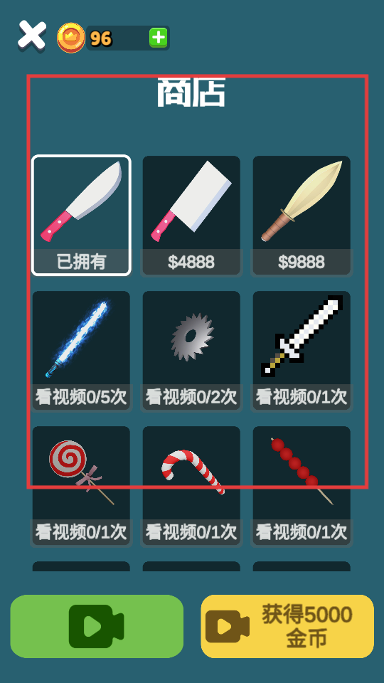 4、进入商店,使用积累的金币或通过看视频,解锁新的刀具等道具,助力后续游戏。