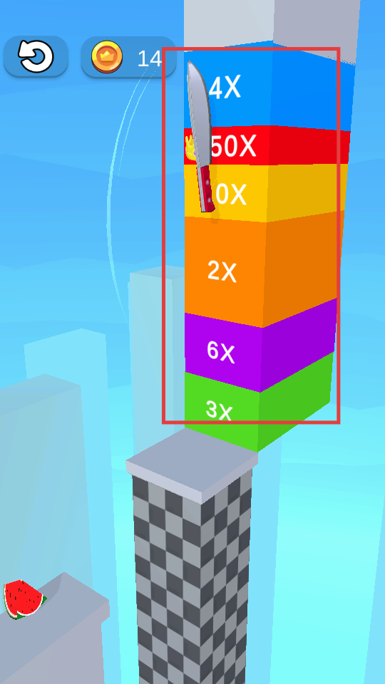 2、瞄准带有倍数标识的彩色方块切割,提升金币获取的倍数。