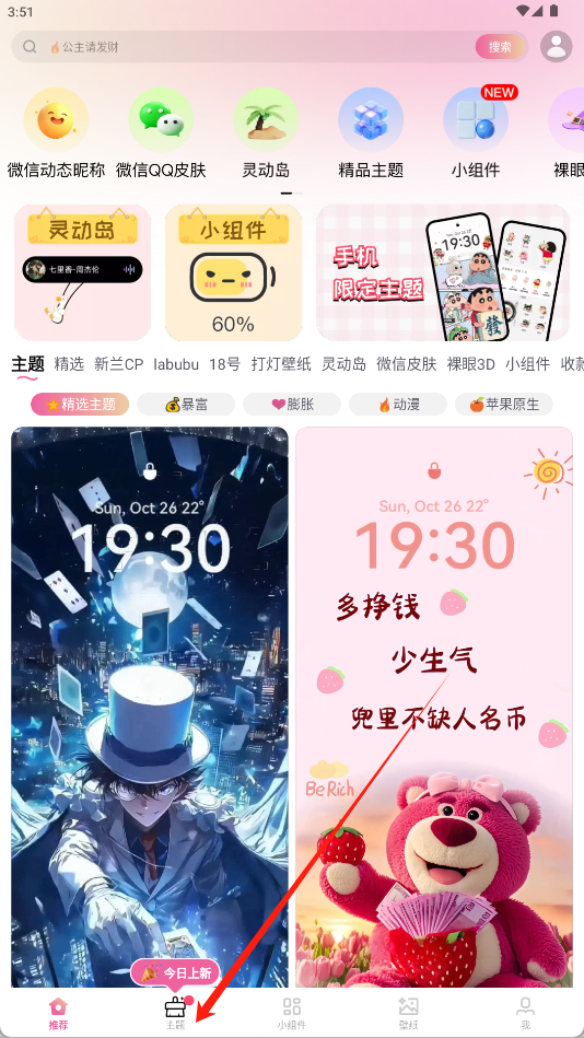 1、打开软件后,在首页底部导航栏选择“今日上新主题”。
