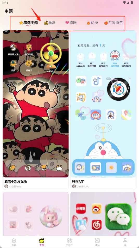 2、进入主题页选择喜欢的主题动画图片或最新推荐的精选主题的壁纸。