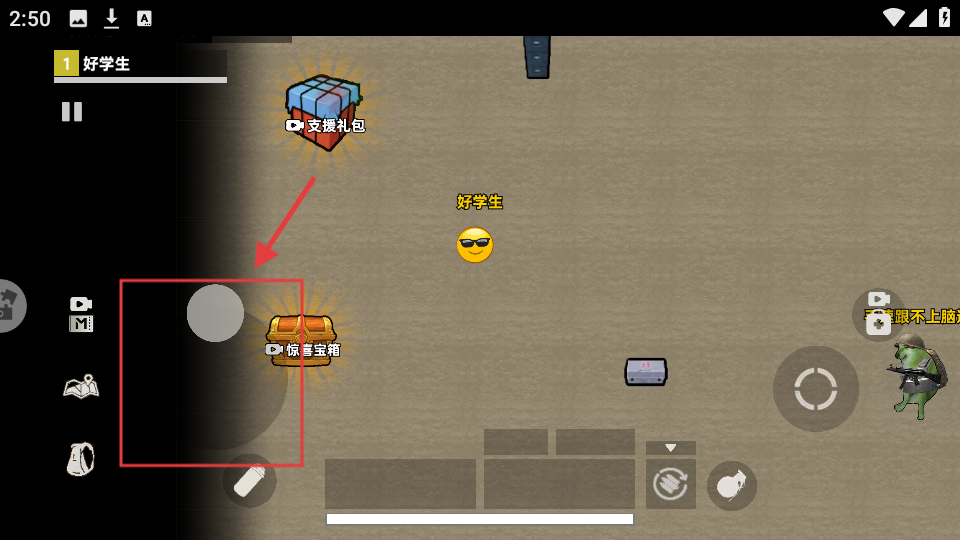 2、操控左侧摇杆移动角色,靠近【惊喜宝箱】【支援礼包】,优先获取宝箱物资,补充战斗资源。