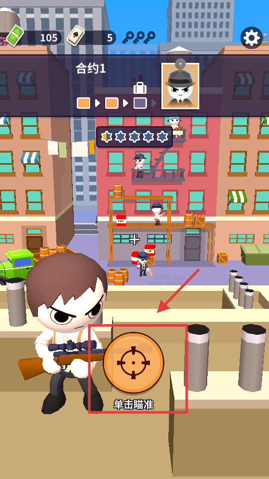1、点击【单击瞄准】按钮,开启狙击瞄准模式,锁定目标后射击,提升精准度消灭敌人。