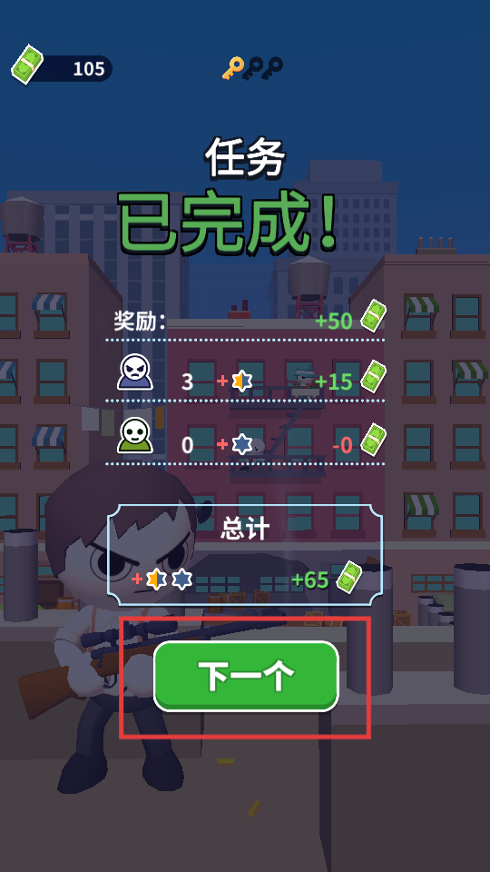 4、任务完成后点击【下一个】按钮,进入下一关,积累奖励用于提升装备与能力。