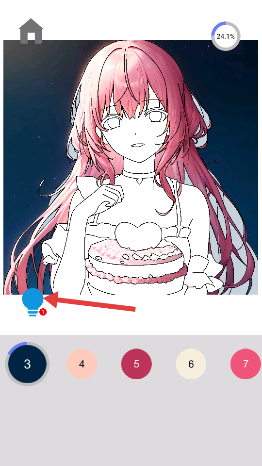 4、若涂色遇到疑问,点击灯泡图标获取提示,继续为对应区域涂色。