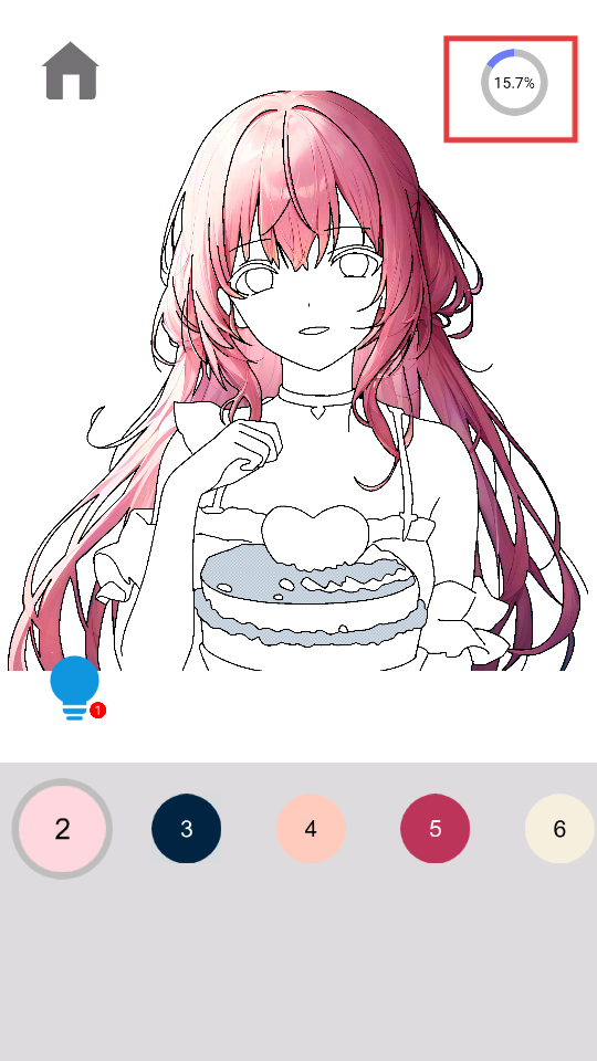 3、切换到数字【2】的颜色,继续为相应区域涂色,关注右上角完成进度。
