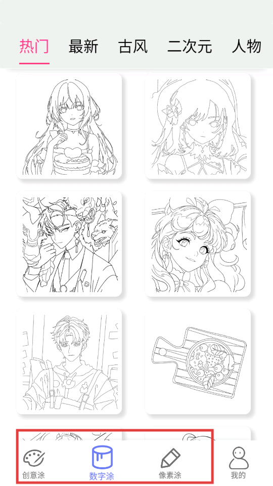1、选择【数字涂】模式,挑选喜欢的线稿,进入数字涂色环节。