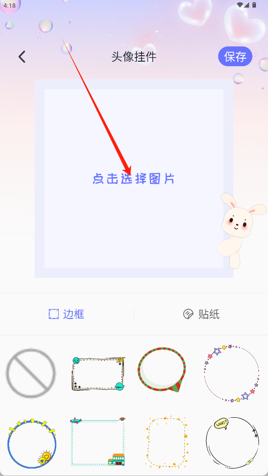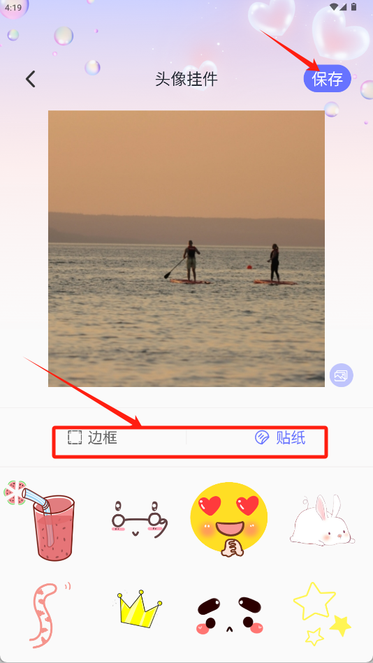 3、在底部贴纸库中选择装饰元素添加到头像,最后点击右上角“保存”完成制作。