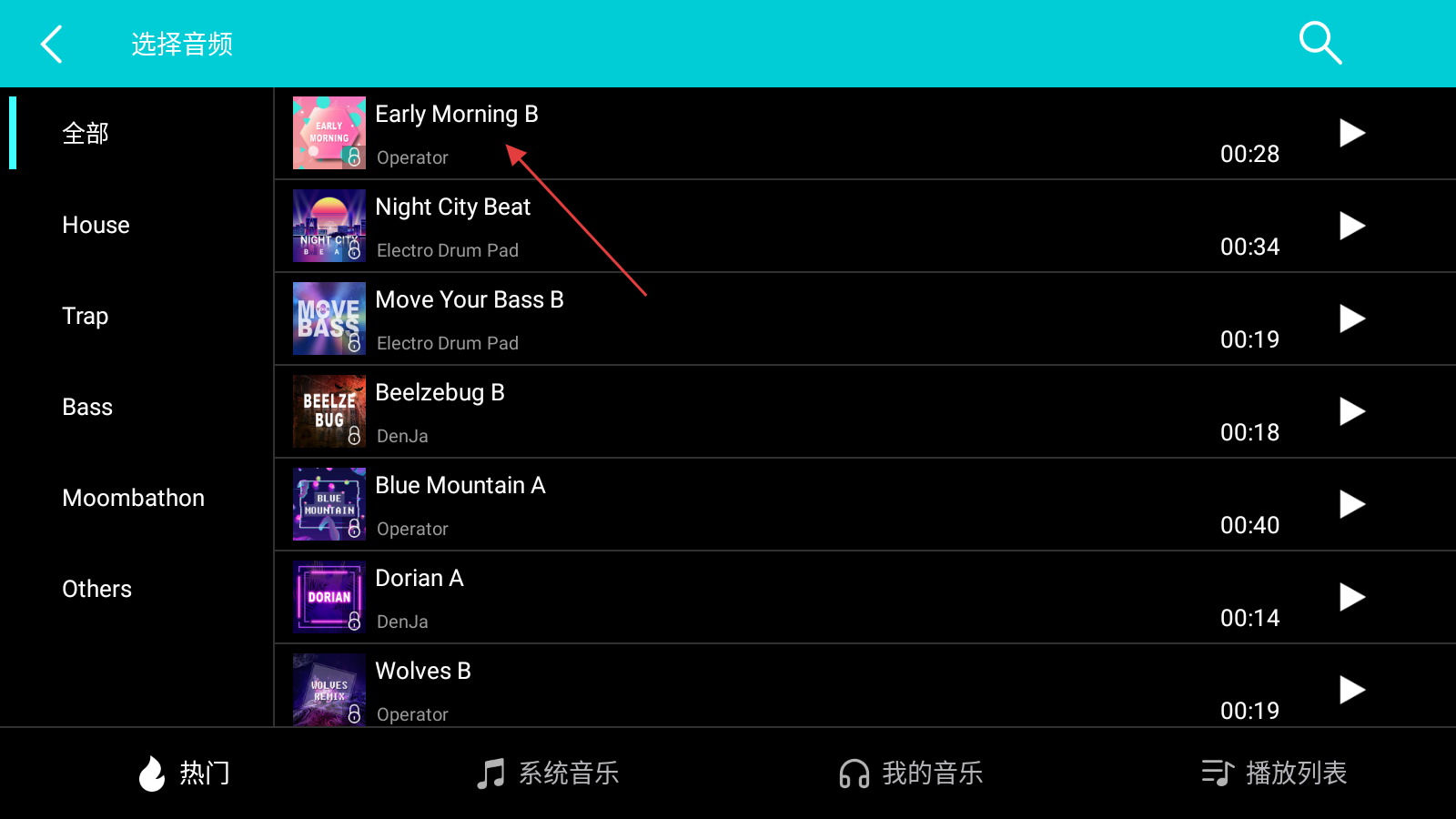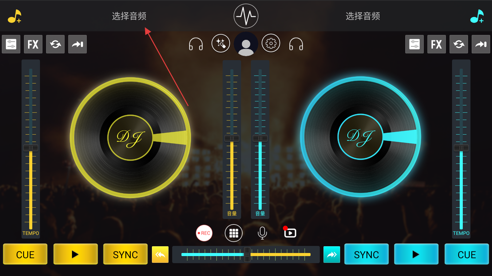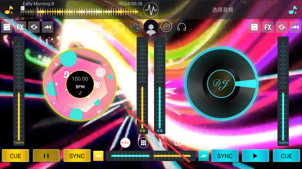 1、在DJ操作界面,点击上方【选择音频】,进入音频选择列表页面。