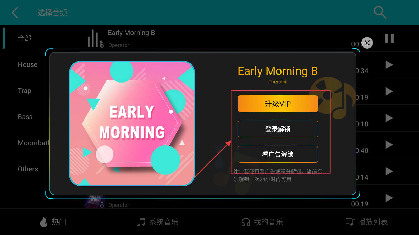 2、在音频选择列表里,点击【需要的音频】,弹出解锁方式选择窗口。