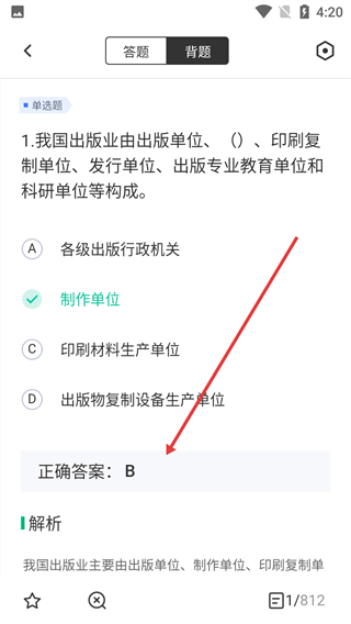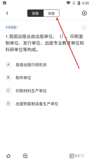 3、在答题页面,可点击【背题】,以背题模式查看题目及选项来记忆知识点。