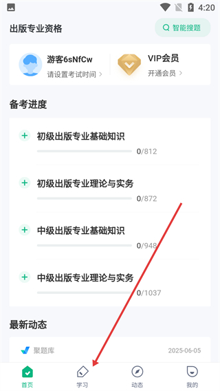 1、在“出版专业资格”首页,点击底部【学习】选项,进入学习页面。