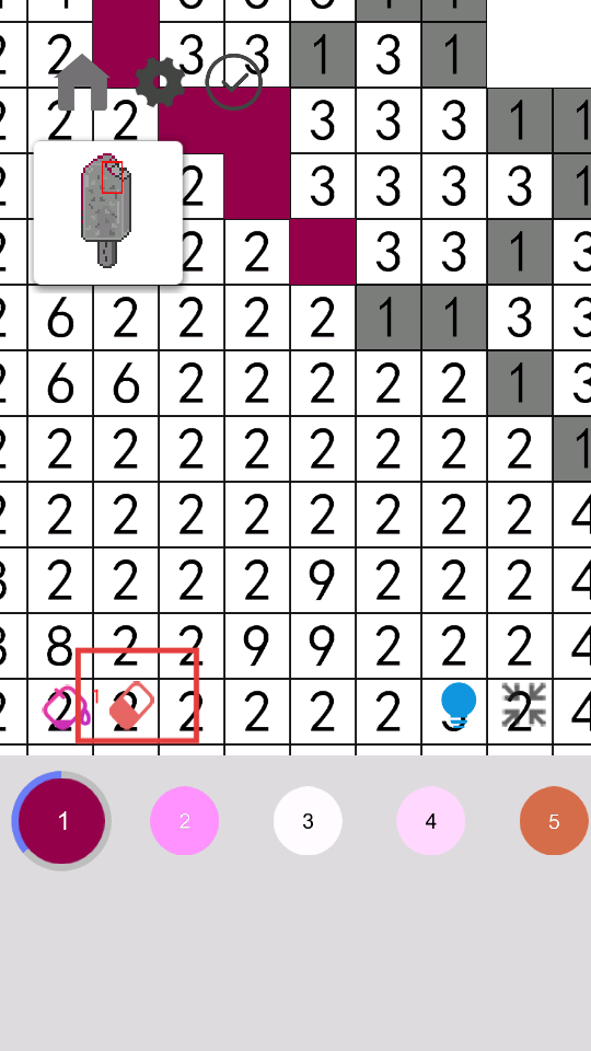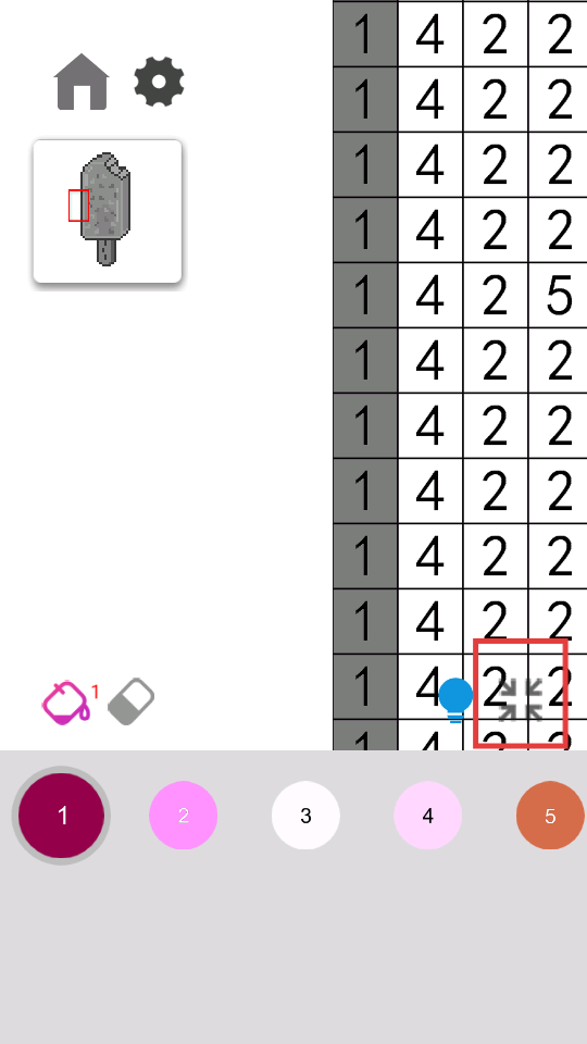 2、选择对应数字颜色为像素网格中标记的区域涂色,右下角图标可放大线稿。