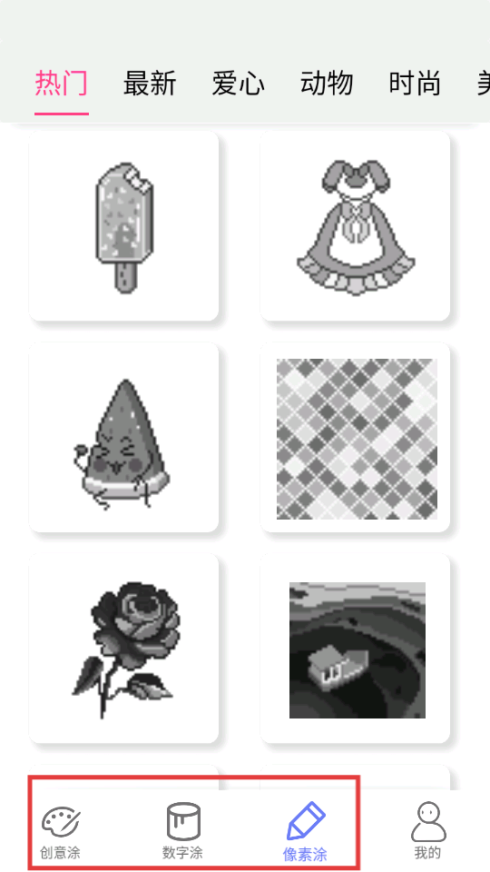 1、选择【像素涂】模式,挑选喜欢的像素画稿,进入像素涂色环节。