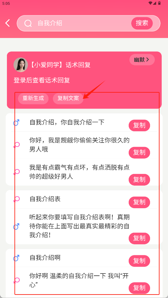 3、在自我介绍话术列表中选择一条内容,点击右侧的粉色“复制”即可使用。