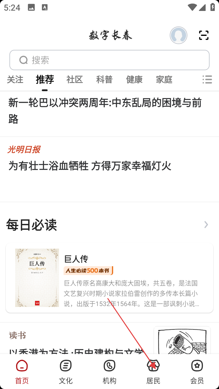 1、在“数字长春”首页,点击底部的【居民】选项,进入居民服务页面。