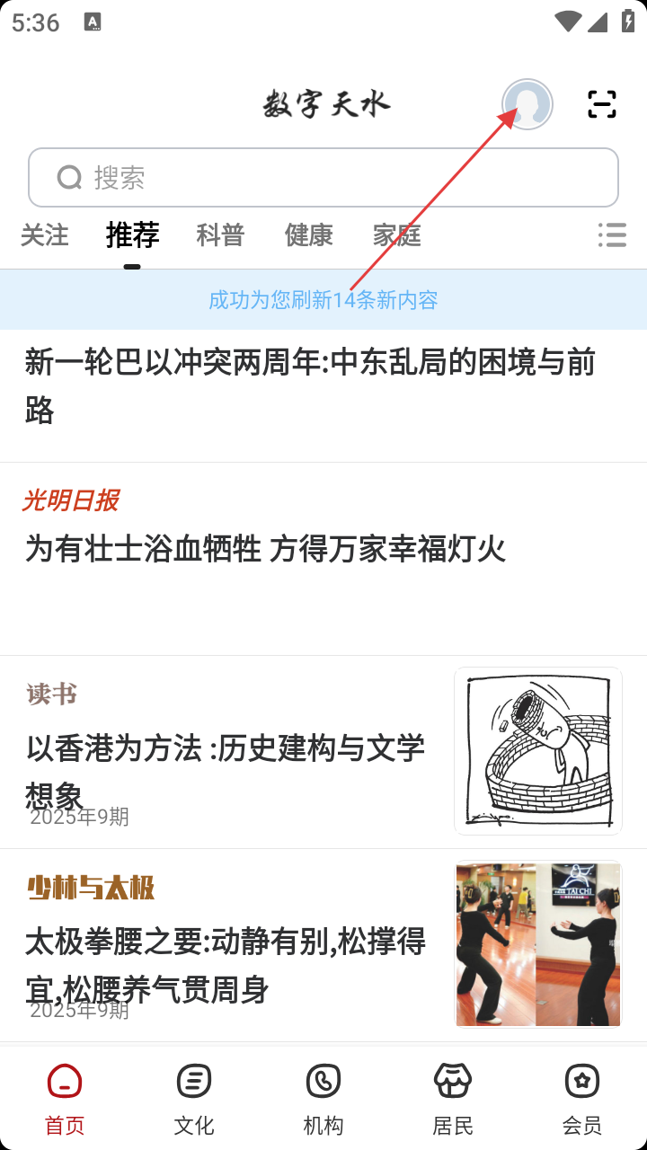 1、打开数字天水,在“数字天水”首页,点击右上角的头像图标,进入个人相关页面。