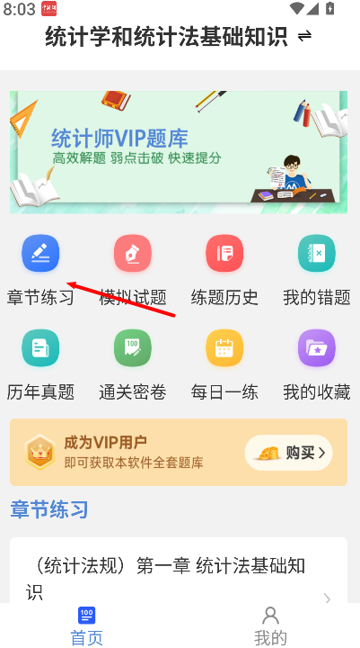 1、打开《统计师牛题库》app后,点击进入“章节练习”模块,开始系统化学习与训练。
