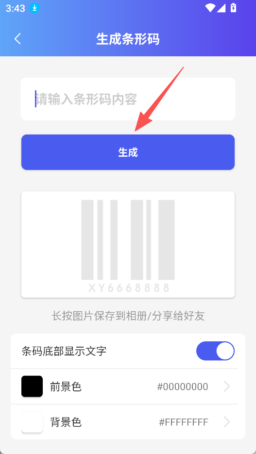1、支持生成条形码,可保存或分享,还能设置条码底部文字、前景色和背景色。