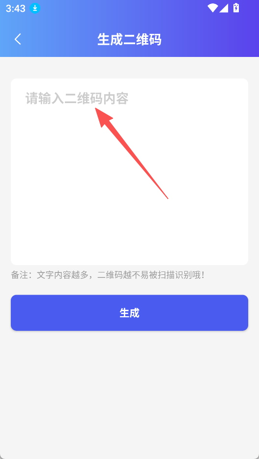 2、可生成二维码,输入内容后生成,同时有文字内容影响识别的备注提示。