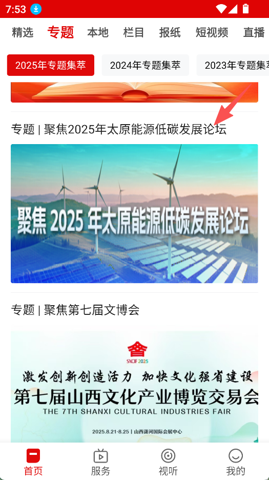1、打开软件,选择“专题”板块,查看不同年份专题集萃。