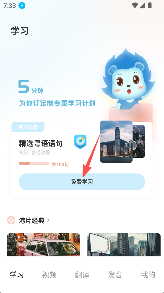 1、打开软件,点击免费学习,进入精选粤语语句课程。