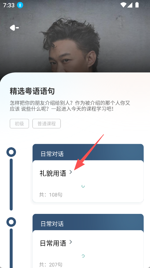 2、内容分类细致,精选粤语语句课程细分为礼貌用语、日常用语等类别,便于针对性学习 。