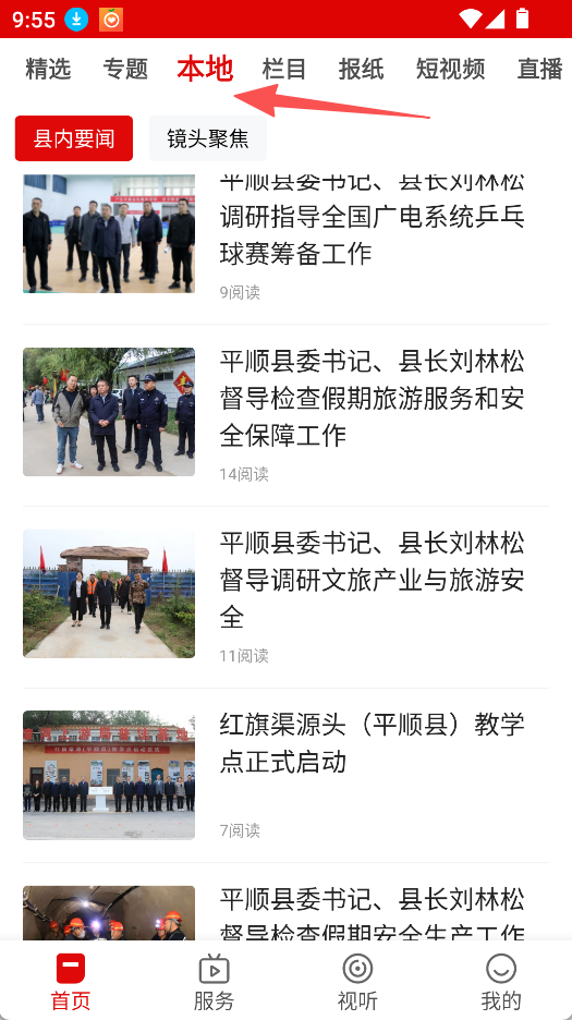 1、打开软件,在首页浏览精选、专题等板块或查看本地资讯。
