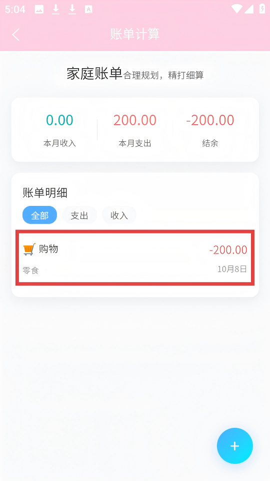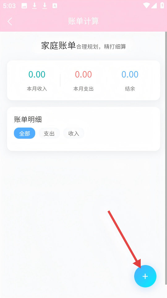 2、在【账单计算】页面,点击右下角蓝色【+】按钮,打开新增账单的界面。