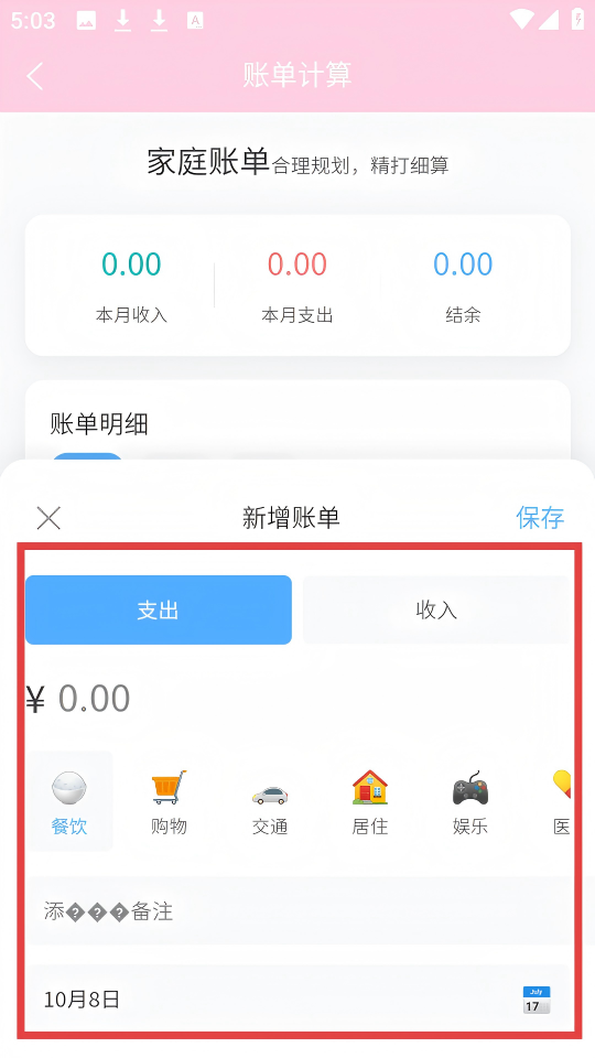 3、在新增账单界面,选择【支出】或【收入】,填写金额,选择消费分类,还可添加备注和选择日期。