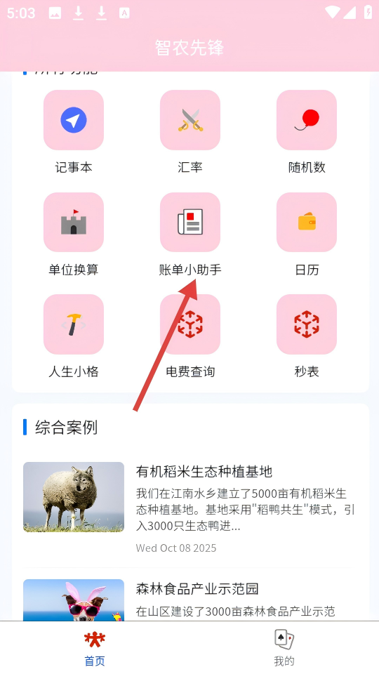 1、在【智农先锋】首页,点击【账单小助手】图标,进入账单计算页面。