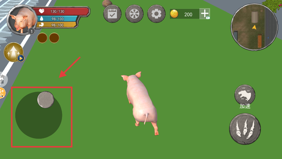 2、通过左下角【摇杆】控制小猪移动,在城市中探索,依据等级规划路径找线索宝藏。