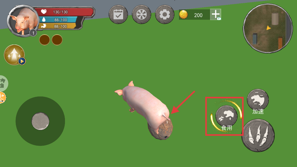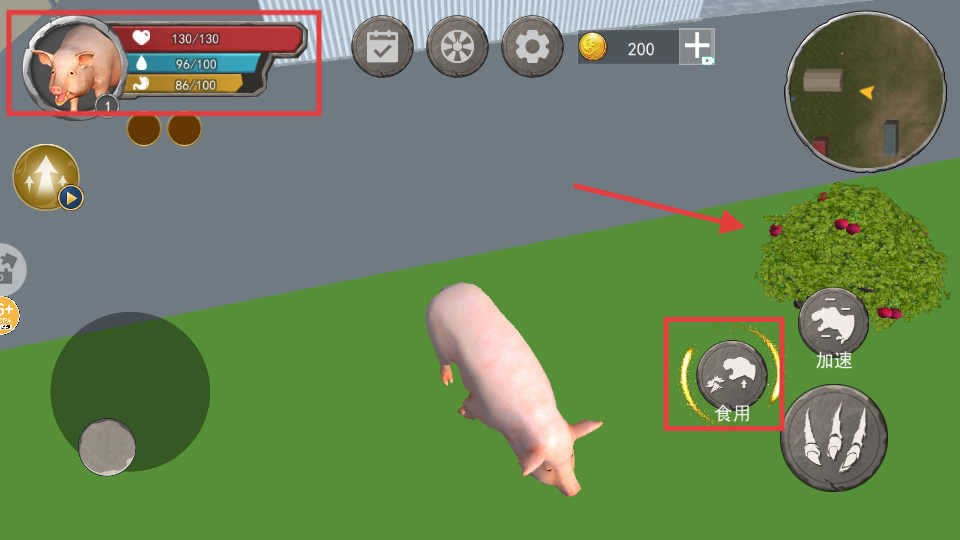 4、关注左上角小猪【状态值】,食物能恢复/提升,优先吃果树等食物维持/增强状态。