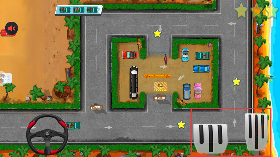 2、通过【方向盘】与【油门-刹车-踏板】操控车辆,结合路线规划,将车驶向对应停车位。