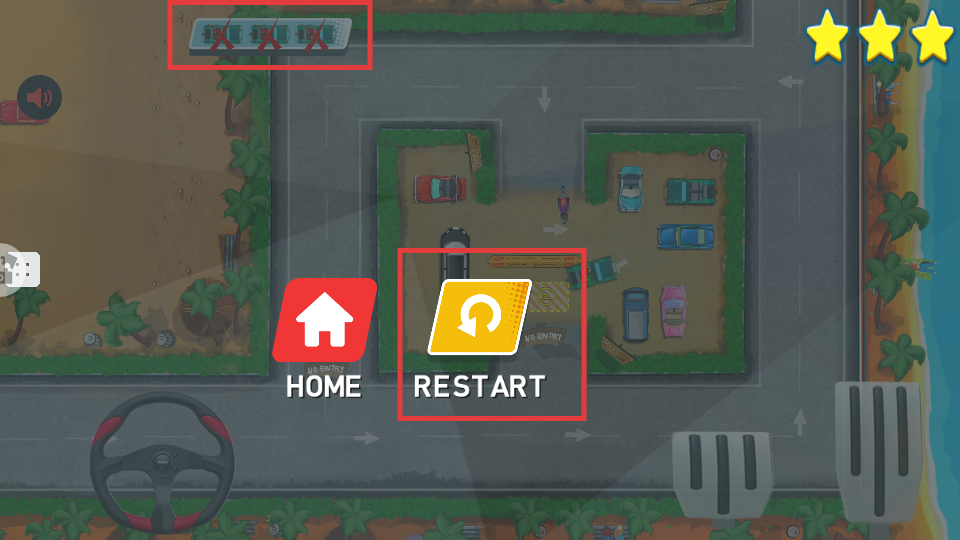 4、若停车失误,点击【RESTART】重置关卡,参考上方车辆状态,优化驾驶策略再尝试。