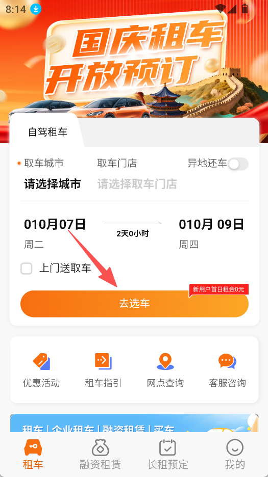 1、支持国庆租车预订,自驾租车可选城市、门店,设取还车时间,还能选上门送取车,流程灵活。